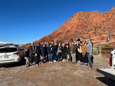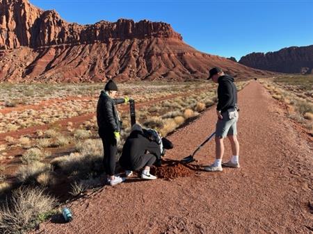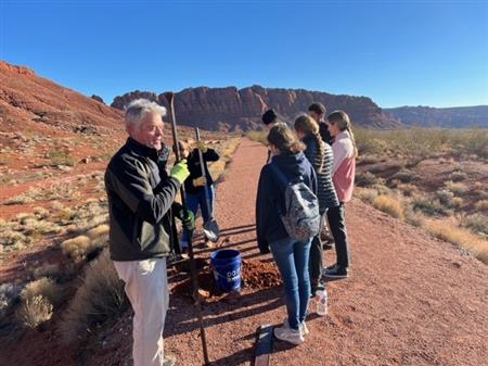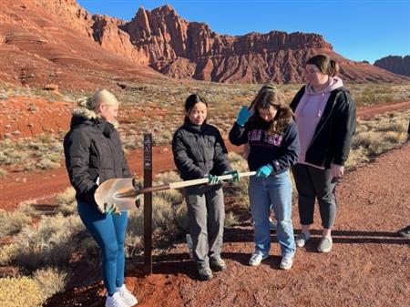 34 volunteers from St George Sunrise Rotary Club, Sun River Hiking Club and Utah Tech spent two hours putting up new signage on the legal trails since the illegal trails were to muddy to walk on. The Park Ranger from Snow Canyon introduced the tortise habitat and the goal of this project to the students.